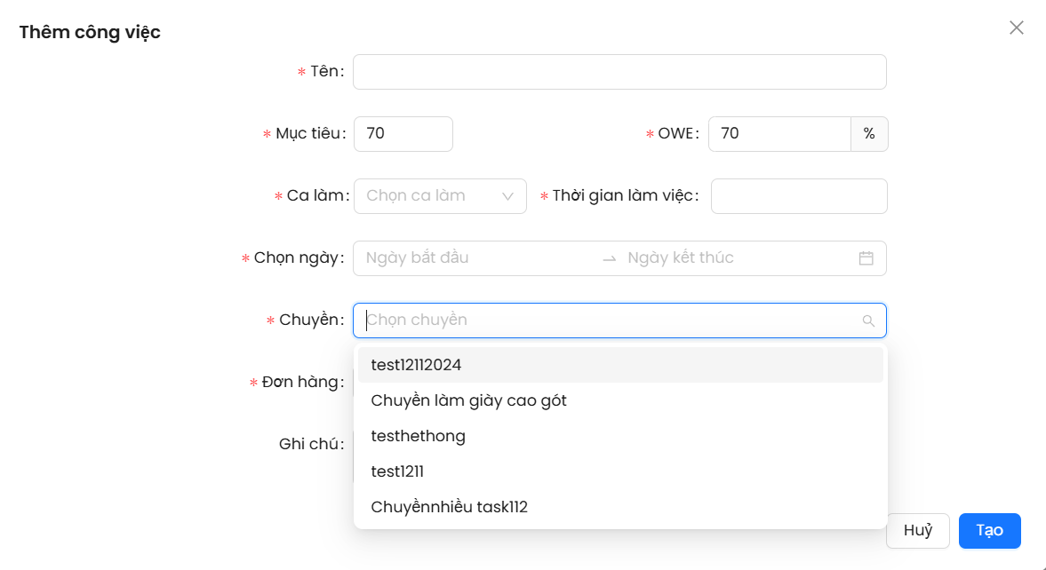 Khi thêm công việc không hiển thị hết tất cả các chuyền.