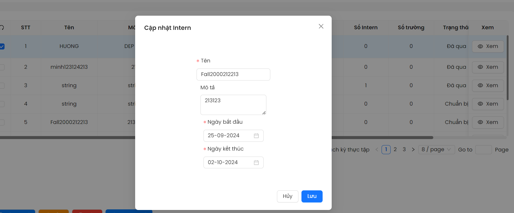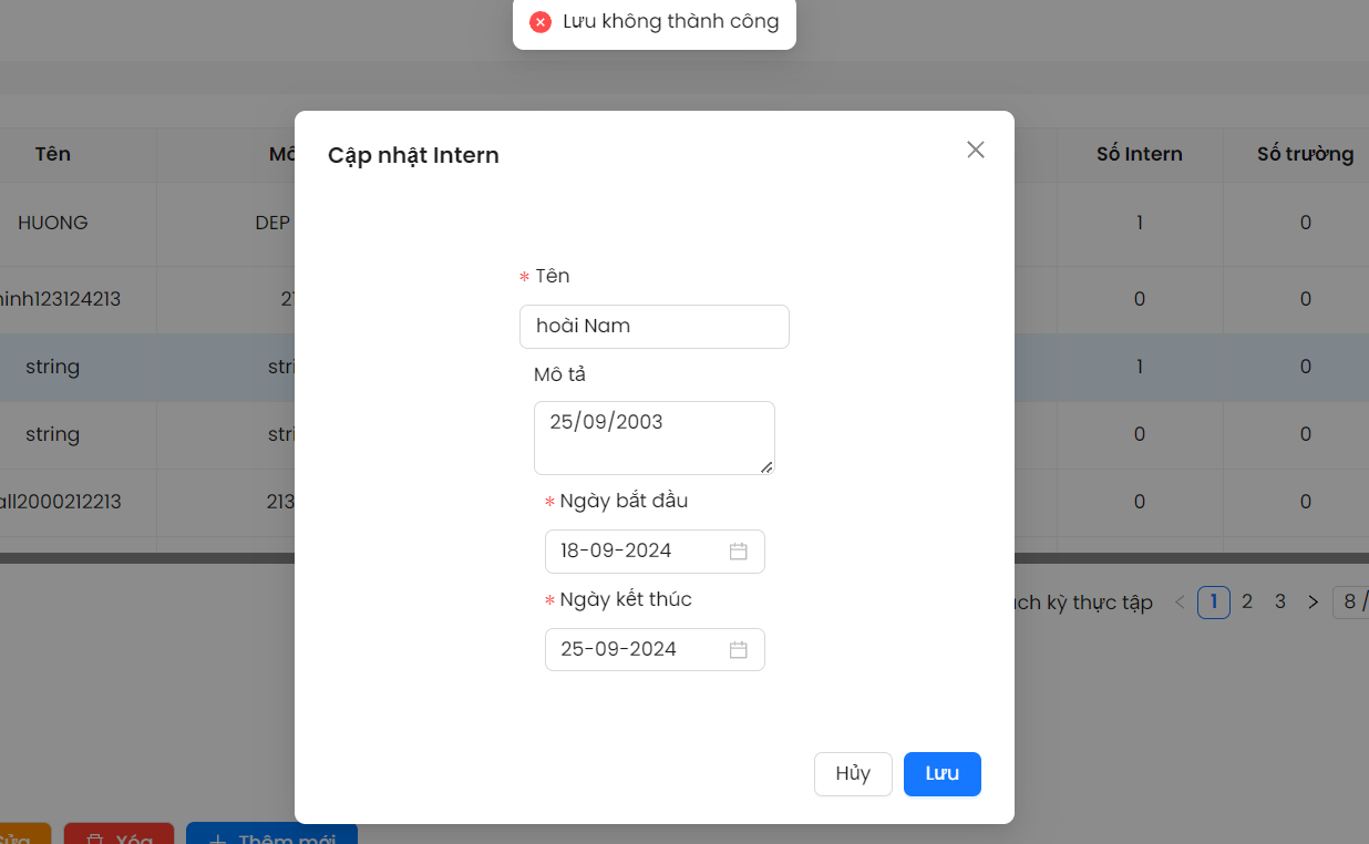 - Button 'Xem' : Bấm vào thì chỉ xem . không được cho phép sửa . Messbox 'Sửa' thì không thực hiện cập nhật lại dữ liệu . Bảng Chi tiết kì thực tập lỗi Set ngày bắt đầu và kết thúc . In ra 2 bảng 'Chi tiết kì thực tập' và cập nhật Intern.