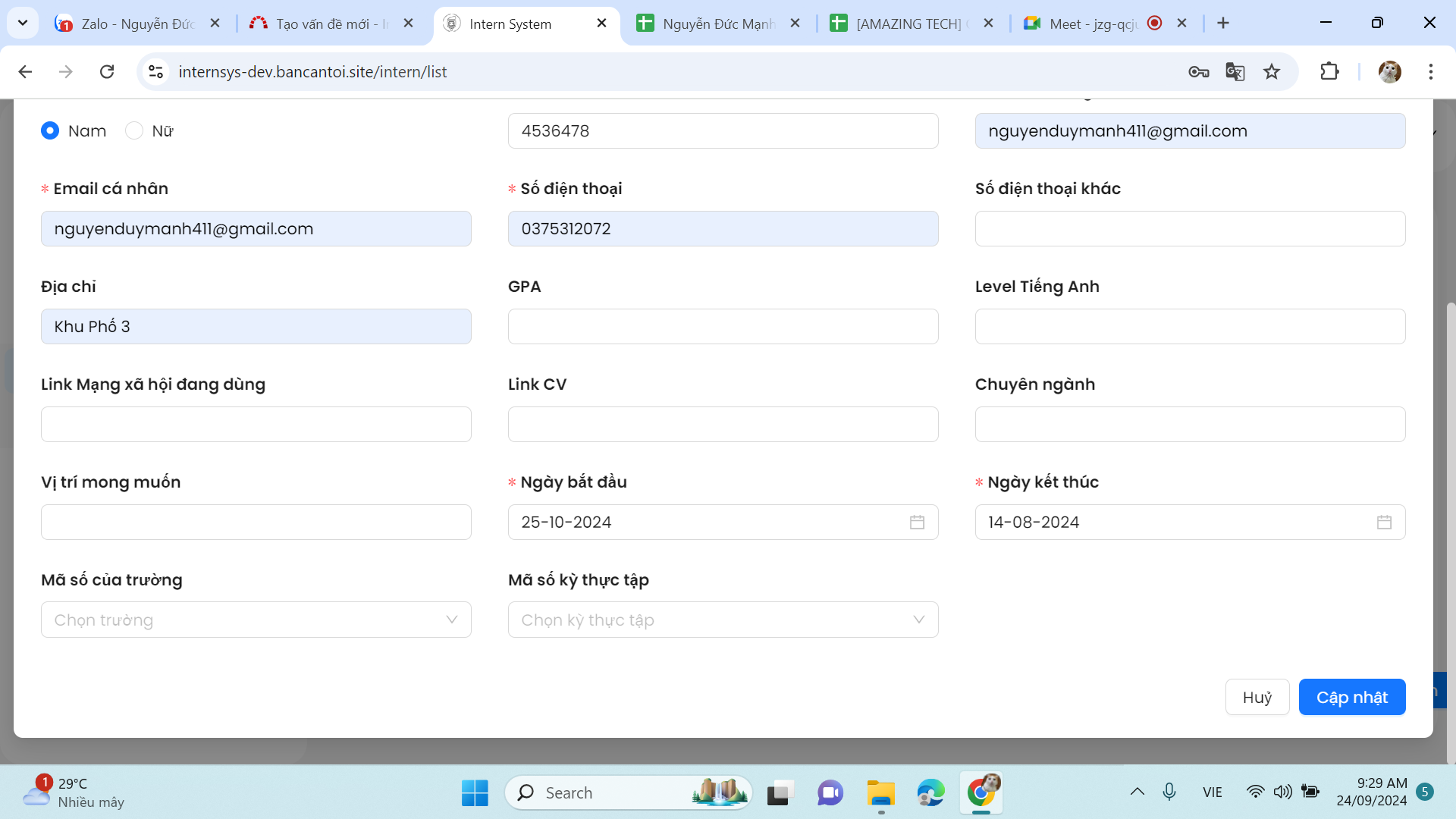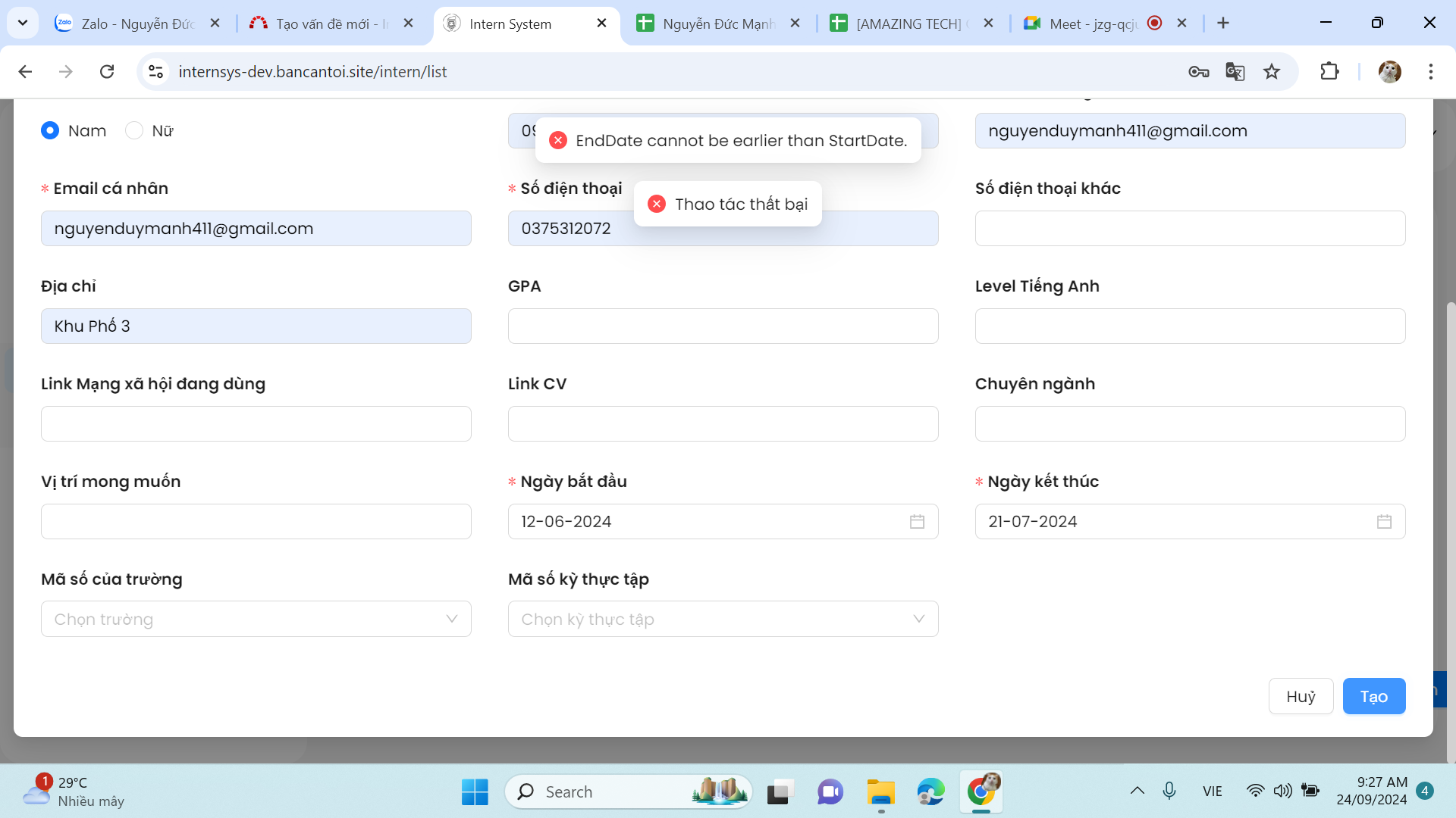 2.Nhập ngày kết thúc nhỏ hơn ngày bắt đầu vẫn cập nhật được