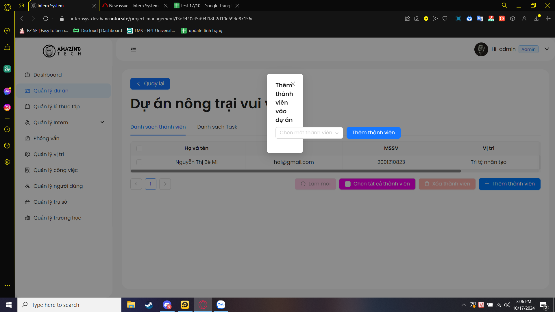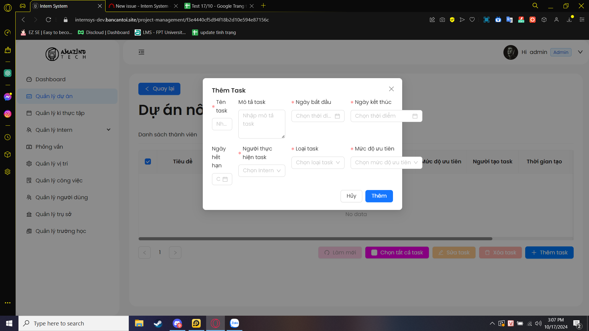 Các hộp thoại thêm task và thành viên vào dự án chưa hoàn chỉnh
