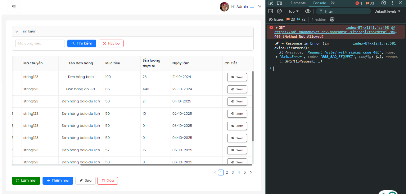 Mô tả: Khi bấm nút "Xem" ở phần chi tiết trong Quản lý công việc, hệ thống hiện thông báo lỗi và trả về lỗi 405