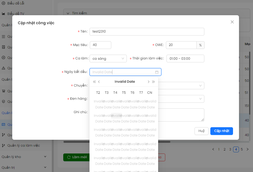 Mô tả: Khi cập nhật 1 công việc, phần ngày bắt đầu và kết thúc bị lỗi invalid.
