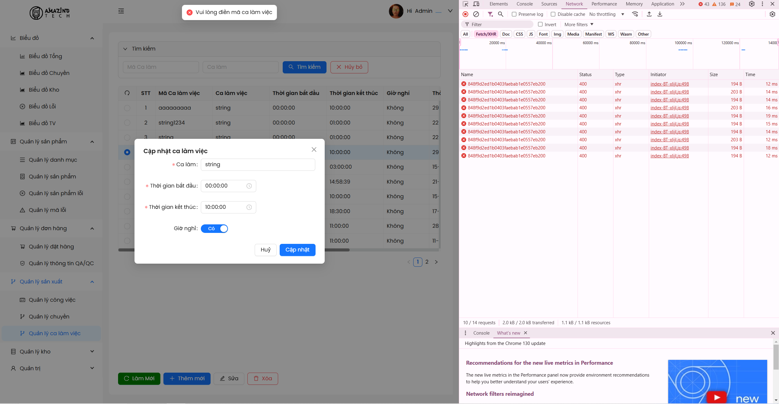 Lỗi khi cập nhật ca làm việc điền đầy đủ thông tin nhưng lại đưa ra lỗi phải nhập mã