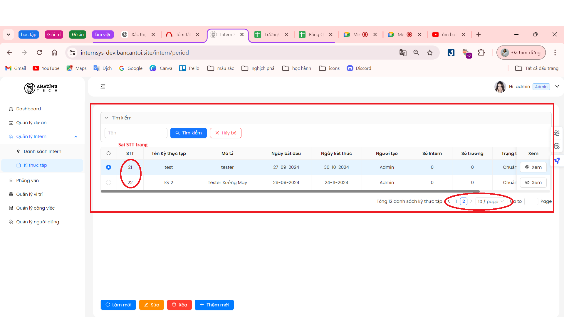 3.Lỗi hiển thị STT.(Trang 1: Hiển thị STT từ 1-10 ; Trang 2: Hiển thị STT 11-20)